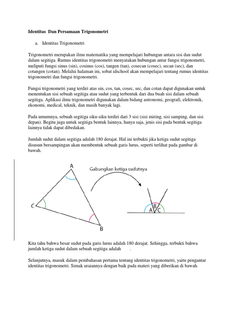 Persamaan Trigonometri Cotangen. Trigonometri adalah ilmu matematika yang mempelajari tentang sudut, sisi, dan perbandingan antara sudut terhadap sisi. Dasarnya menggunakan bangun datar segitiga.